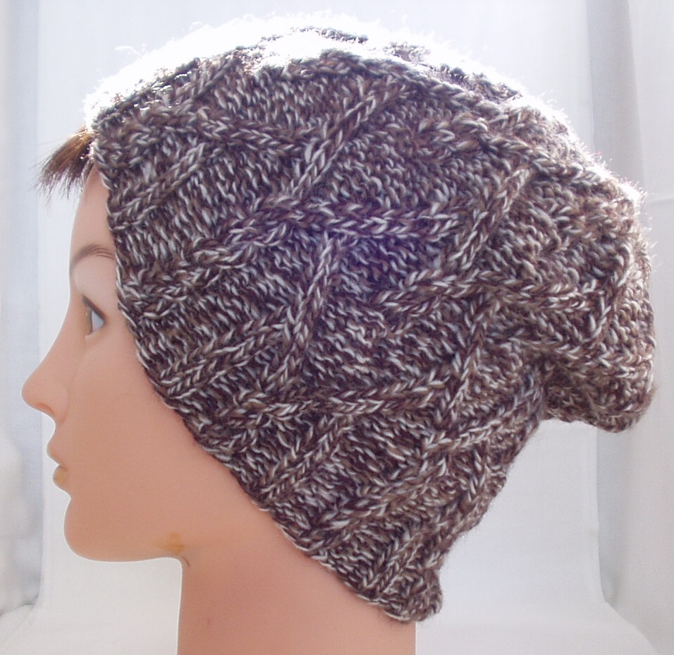 色んな色が入ってる糸で編んでありましたので、名前のような帽子でした。これは混じりの糸なので模様がわかりにくいですが、4段毎の藤編みで2目一度は左上だけ。日本では右上と左上を使うのでどうかなと思いましたが、簡単で良いですね。